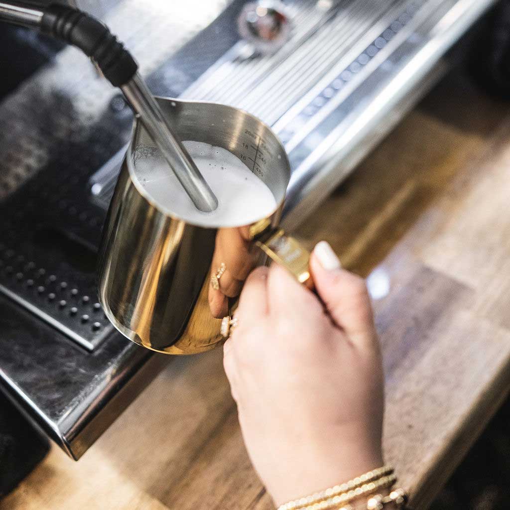- 12-ounce gold frothing pitcher.